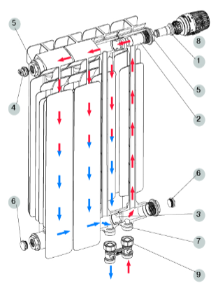 Специально для нижнего подключения разработано конструктивное исполнение алюминиевых и биметаллических радиаторов. Такое исполнение имеет обозначение VENTIL. В зависимости от выбранной модели после сборки радиатор сохраняет все ее теплотехнические и эксплуатационные характеристики. При разработке проекта системы отопления необходимо учесть гидравлические особенности узла нижнего подключения и термостатического клапана согласно оговоренной комплектации.
