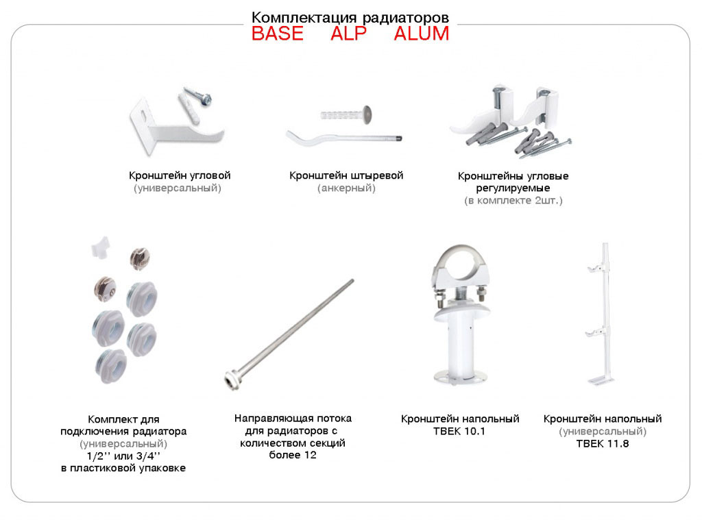 Радиаторы RIFAR поставляются, в зависимости от моделей, в различной комплектации. Поэтому просьба внимательно ознакомиться с тем, какие комплектующие детали надо приобретать, чтобы впоследствии не возникло вопросов и задержек при их монтаже. Для крепления любых радиаторов необходимы кронштейны. Их выбор зависит от условий места расположения радиатора. Набор остальных комплектующих деталей определяется моделью радиатора, диаметрами труб и схемами подключения.