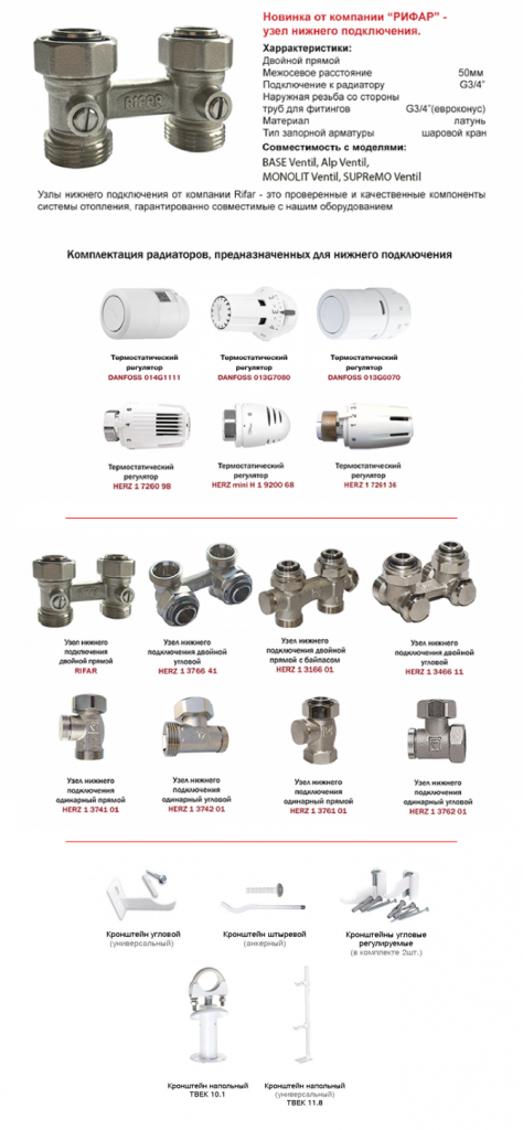 Радиаторы RIFAR, предназначенные для нижнего подключения, в обозначении модели которых присутствует слово Ventil, выпускаются в комплектации, с которой при монтаже, кроме кронштейнов, дополнительно понадобятся только узел нижнего подключения, термостатическая головка и переходники с узла нижнего подключения на трубу. При этом узлы нижнего подключения поставляются хоть и отдельно от радиаторов, но обязательно нами, поэтому их необходимо включать в заказ с указанием типа (1- или 2-трубный) и конфигурации (прямой или угловой), которые должны соответствовать типу системы отопления (1- или 2-трубная) и разводке труб (в полу или в стене/плинтусе). Комплектация же таких радиаторов термостатическими головками со стороны производителя не обязательна, однако при отказе от нее заказчик берет на себя ответственность за соответствие параметров самостоятельно приобретаемой головки и встроенного в радиатор терморегулирующего клапана. Для автоматической регулировки температуры в помещении рекомендуется использовать терморегулятор RIFAR by Heimeier арт. 6000-00.500, полностью совместимый с термостатическим клапаном Heimeier 4335 или термостатический клапан DANFOSS модели RA-N 013G1382, совместимый с автоматическими терморегуляторами DANFOSS 013G7098, 014G1111, 013G6070, 013G7080. Переходники с узла нижнего подключения на трубу, как правило, есть в ассортименте производителей и поставщиков труб, но некоторые из них можно заказать и у нас.